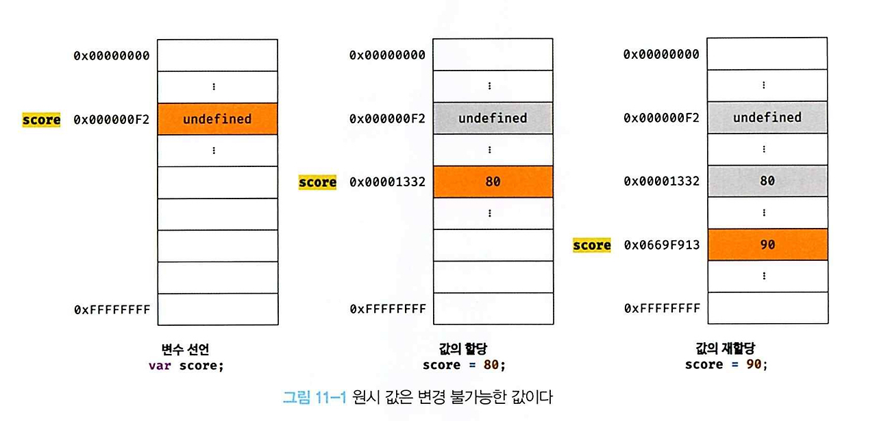 원시 값은 변경 불가능한 값이기 때문에 직접 변경 할 수 없다. 변수에 값을 재할당 할 시에 새로운 메모리 공간을 확보하고 재할당한 값을 저장한 후 변수가 참조하던 메모리 공간의 주소를 변경한다. 값의 이러한 특성을 불변성(imutability) 이라고 한다.