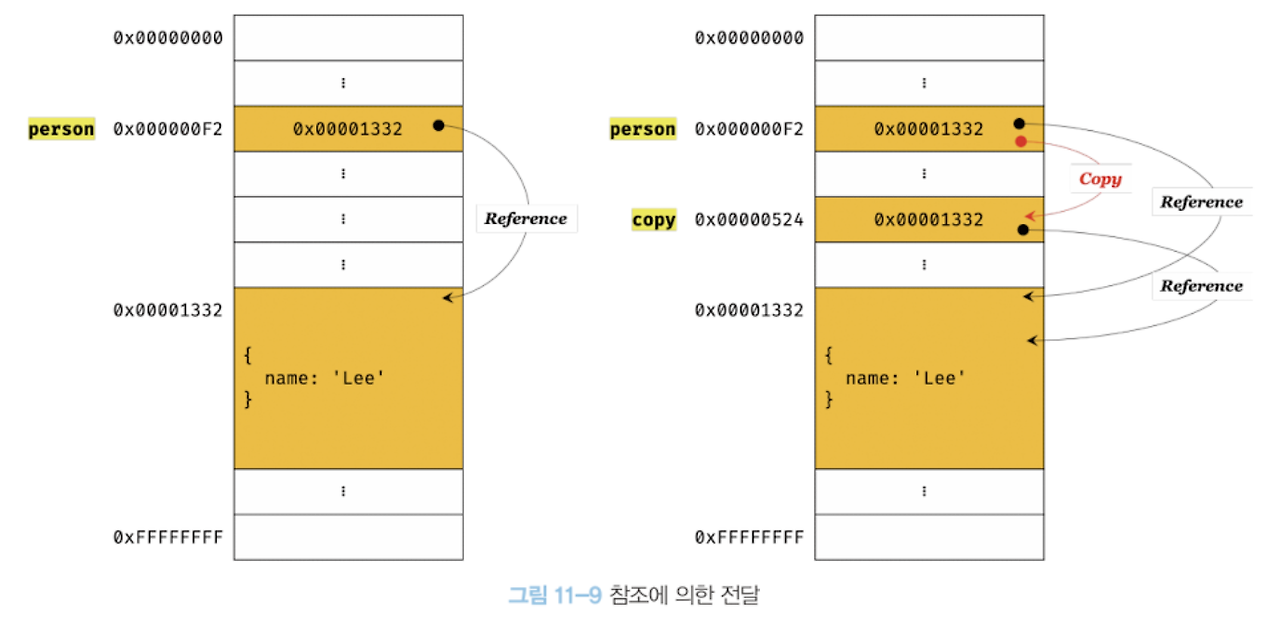 참조에 의한 전달이든 값에 의한 전달이든 식별자가 기억하는 메모리 공간에 저장되어 있는 값을 복사해서 전달한다는 의미는 동일하기 때문에, 자바스크립트 에서는 "값에 의한 전달" 만이 존재한다고 말 할 수 있다. 다만 전달하는 값이 원시 값이냐 참조 값이냐의 차이만이 있다.