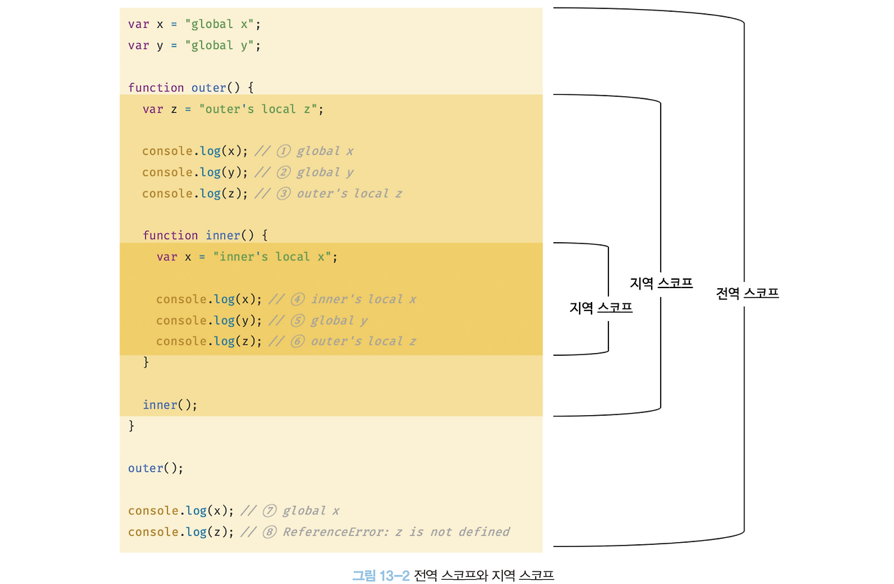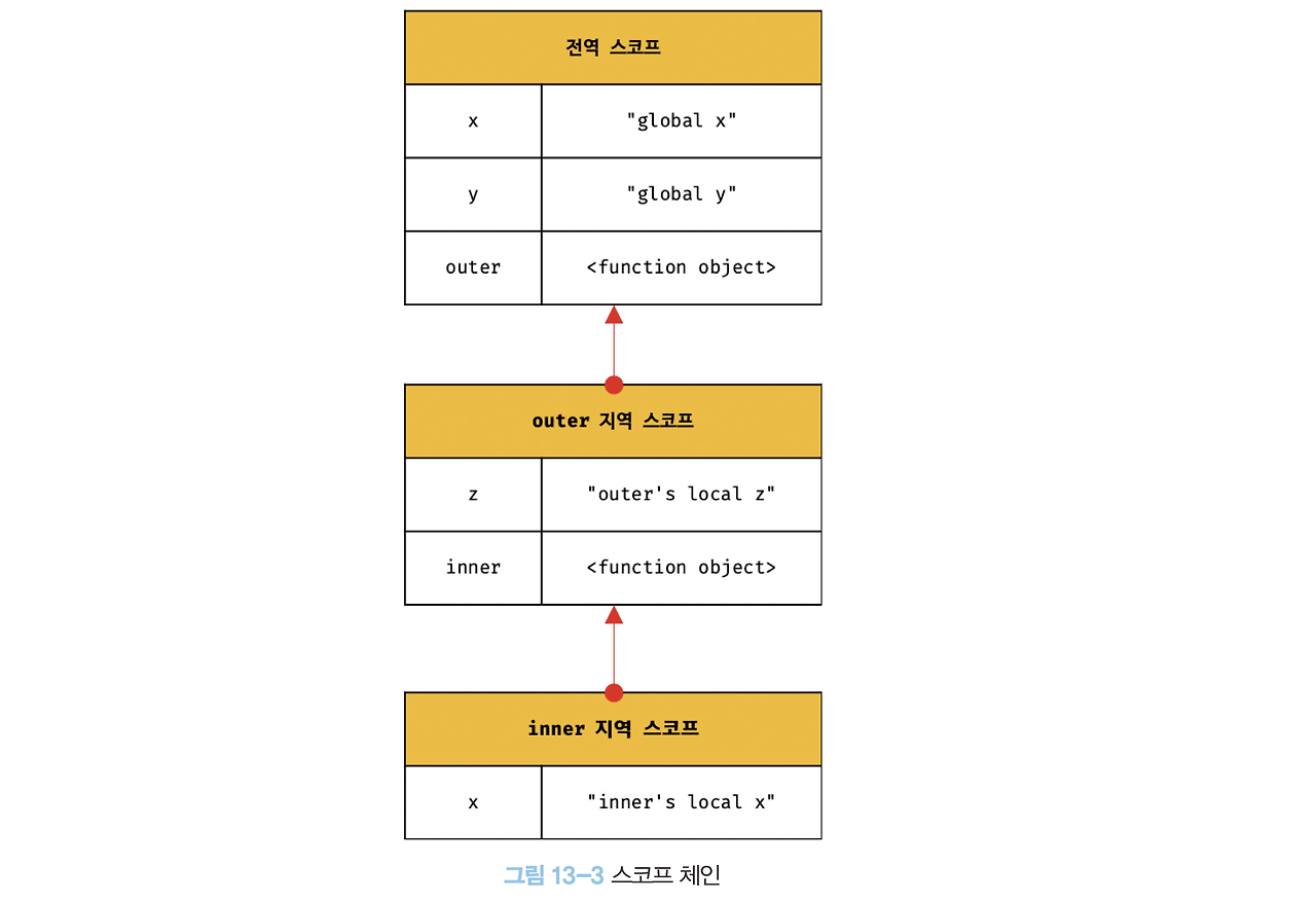 스코프 체인은 실행 컨텍스트의 렉시컬 환경을 단방향으로 연결한 것이다. 전역 렉시컬 환경은 코드가 로드되면 곧바로 생성되고 함수의 렉시컬 환경은 함수가 호출되면 곧바로 생성된다.13.3.1 스코프 체인에 의한 변수 검색